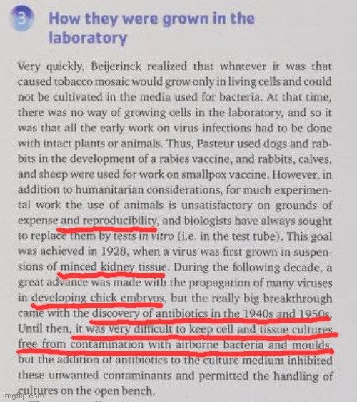 Les manuels eux-mêmes l’avouent : sans antibiotiques, impossible de maintenir des cultures propres — et donc, impossible de pointer un virus du doigt. L’avènement de la virologie n’est pas celui de l’isolement, mais bien celui du contrôle de la contamination :